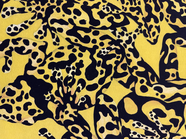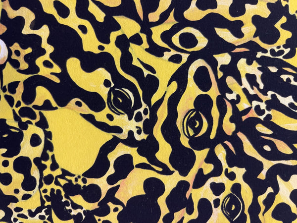 Vivid yellow and black - this piece reflects on climate change. Much like frogs that remain in water as it slowly heats to boiling, humans stay still as the world gets warmer.